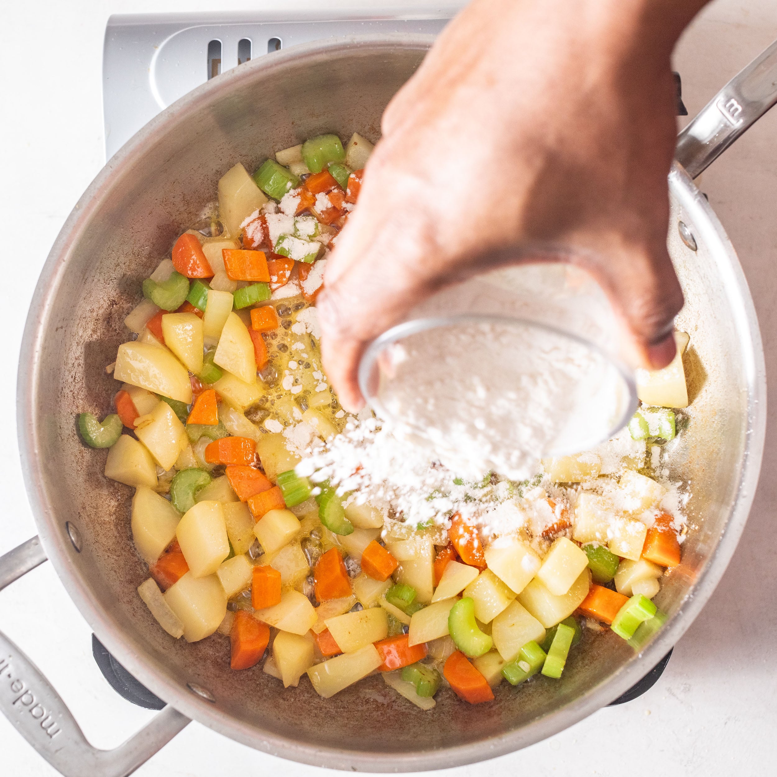 - Sprinkle flour over the vegetables and stir until fully coated.