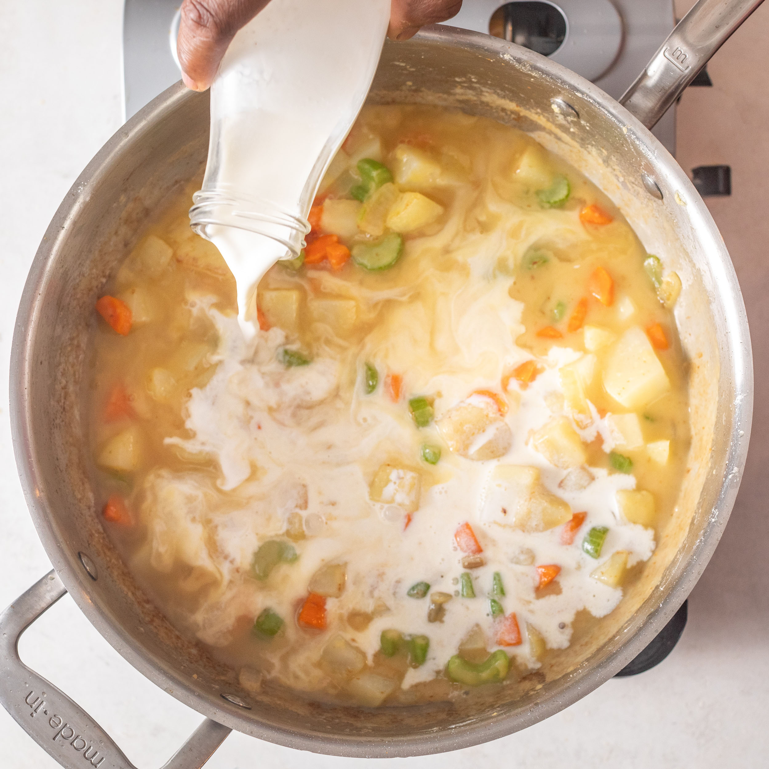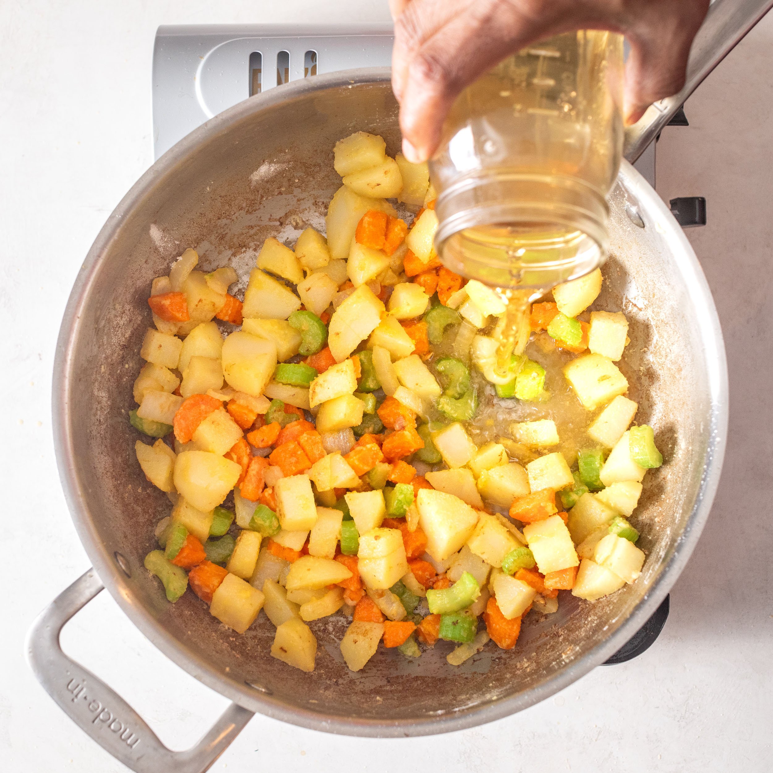 - Melt 2 tablespoons butter in a medium pan over medium heat. Add carrots, celery, potatoes, and onion. Cook 7–8 minutes, or until softened and lightly browned.