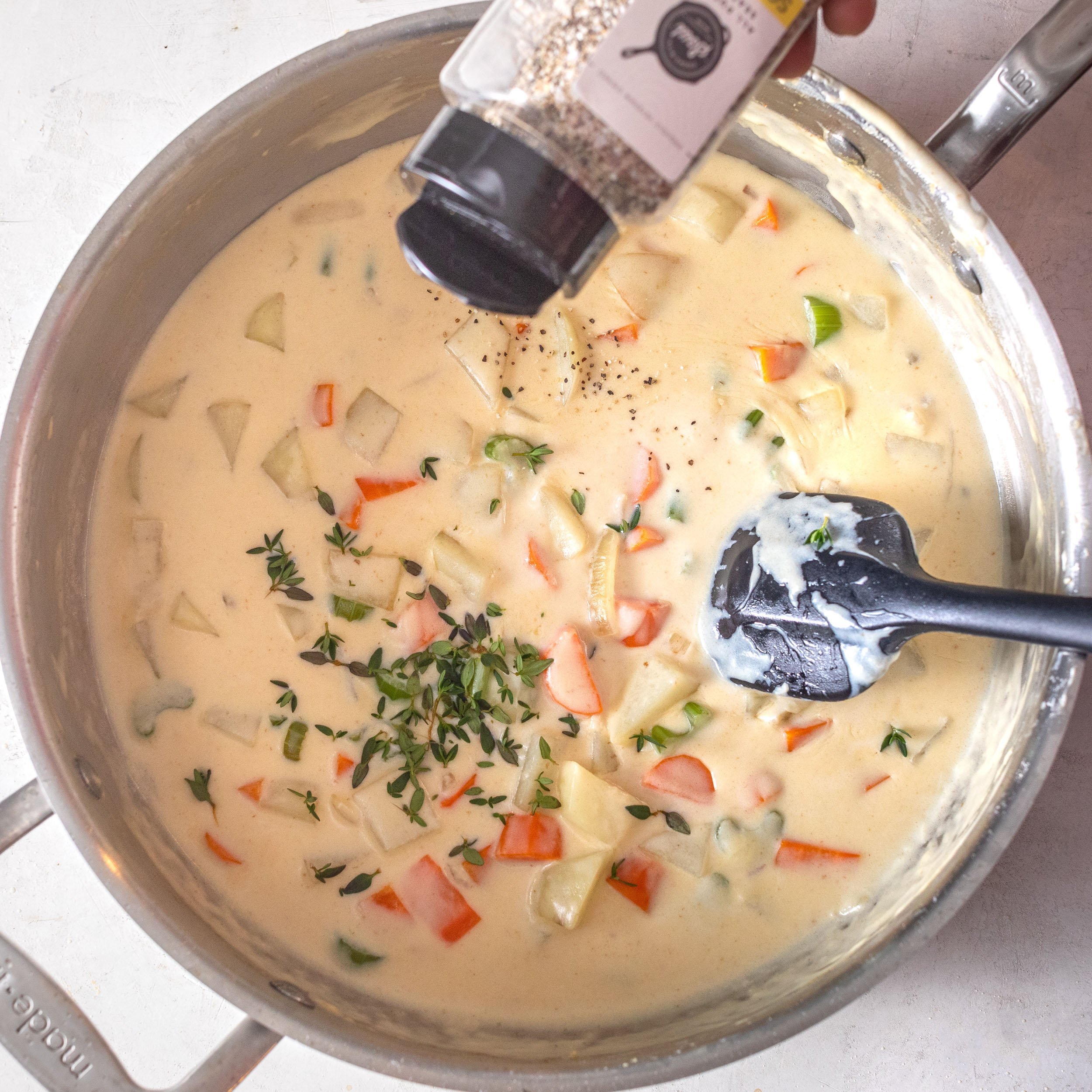 - Slowly pour in the stock, stirring to remove any lumps. Add the half and half and bring to a gentle boil. Reduce heat and simmer 2–3 minutes, until thickened. Stir in thyme and Soul Dust.