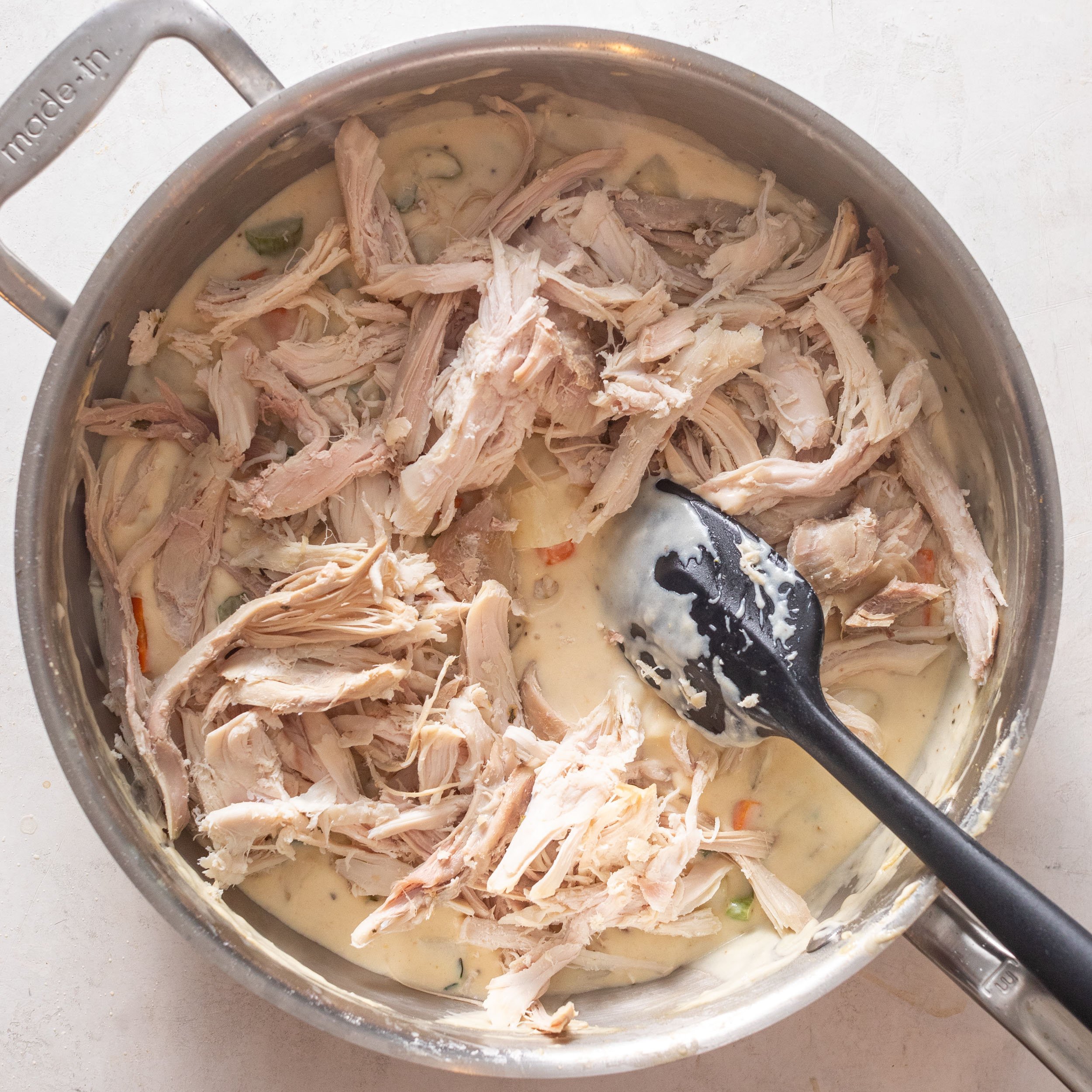 - Remove the pan from heat. Fold in the chopped turkey and peas. Taste and adjust seasoning if needed.