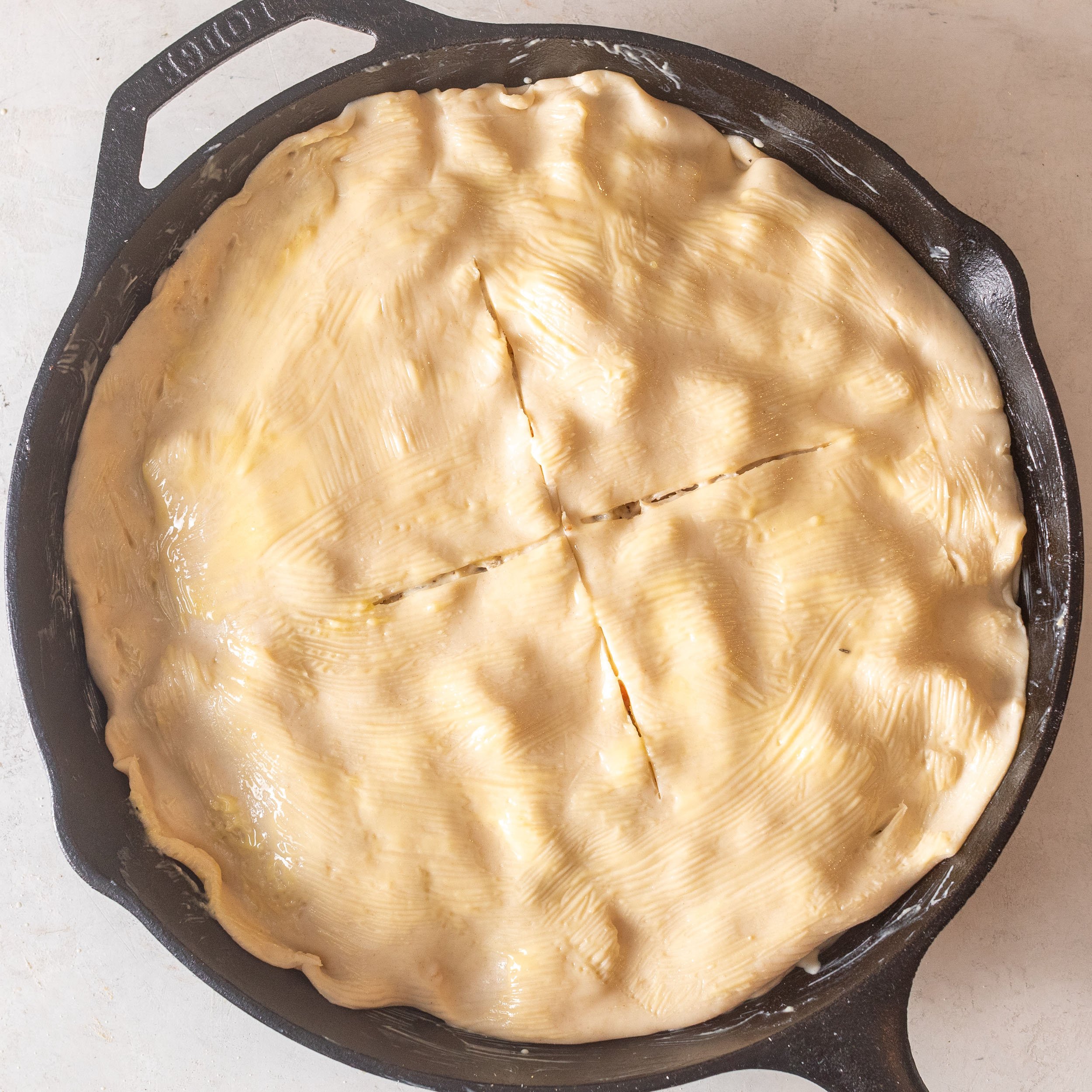 - Spoon filling into the skillet, filling ¾ of the way up. Place the second pie crust over the top and seal edges. Cut four 1-inch slits in the center. Brush with the remaining 1 tablespoon melted butter.